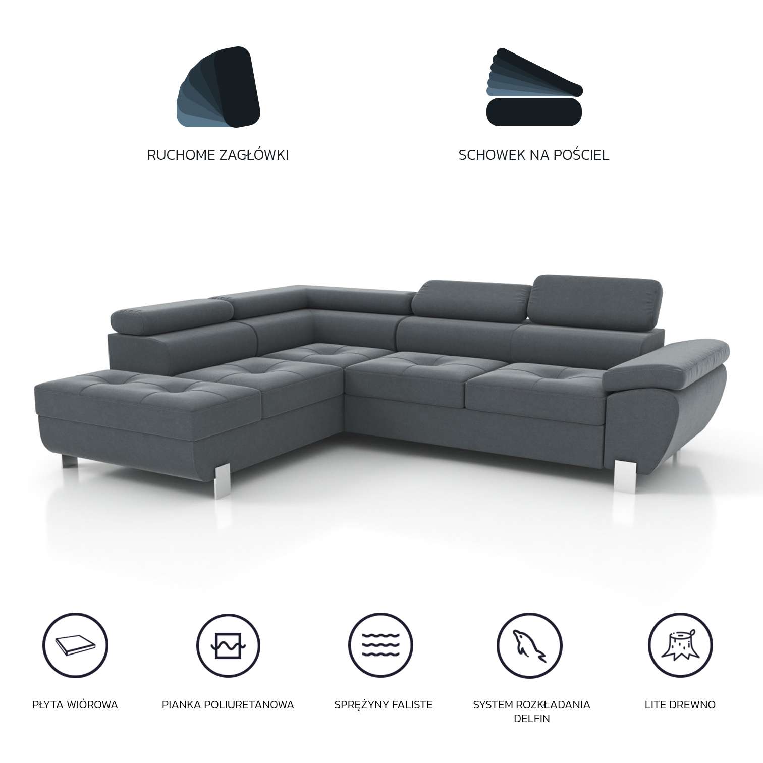 Narożnik Levetto III z funkcją spania 124x194cm i wydłużoną szezlongą 221cm. Pojemnik na pościel, system delfin, regulowane zagłówki.